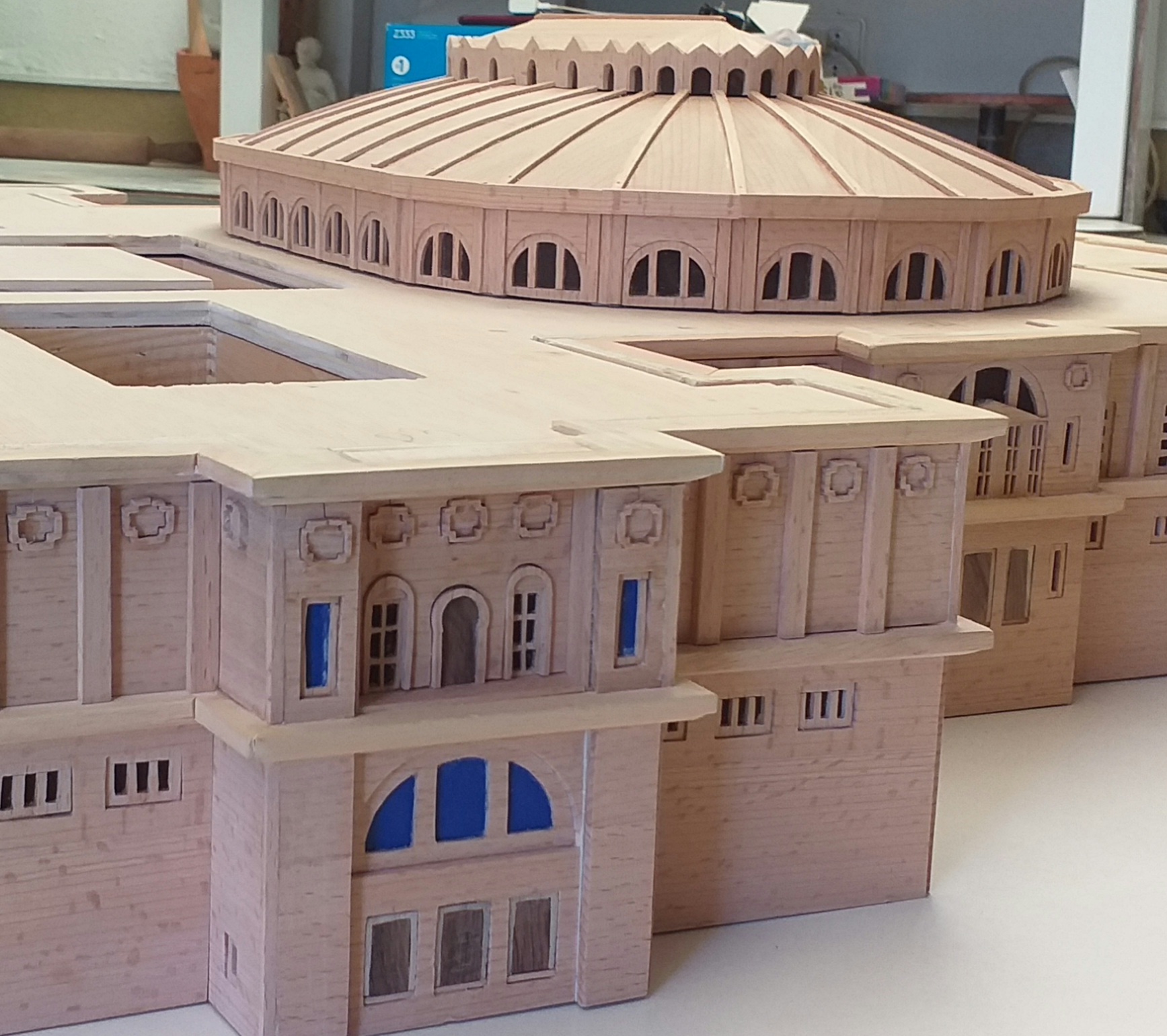 Confecció de la maqueta tàctil de l’edifici del Palau Nacional, seu del MNAC: Artesania en fusta, vidre i terracota
